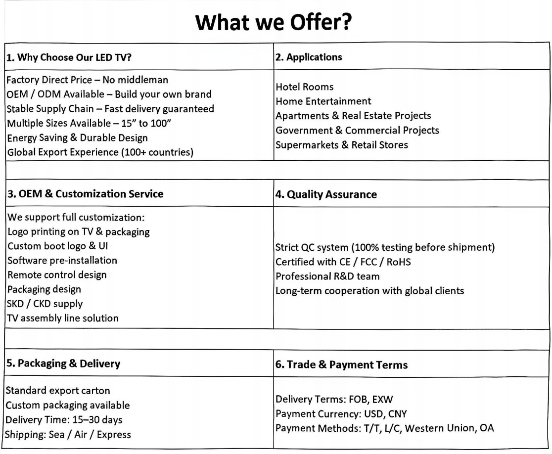 With strong production capacity and strict quality control, we ensure every TV meets international standards. Bulk orders, OEM, and SKD/CKD solutions are all supported.